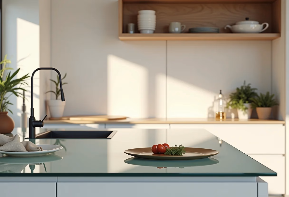 As bancadas de vidro são perfeitas para cozinhas modernas e sofisticadas. Elas podem ser usadas para pia, cooktop ou como ilha central, proporcionando um visual clean e funcional. Além disso, o vidro pode ser utilizado como revestimento de paredes, protegendo contra respingos e facilitando a limpeza.