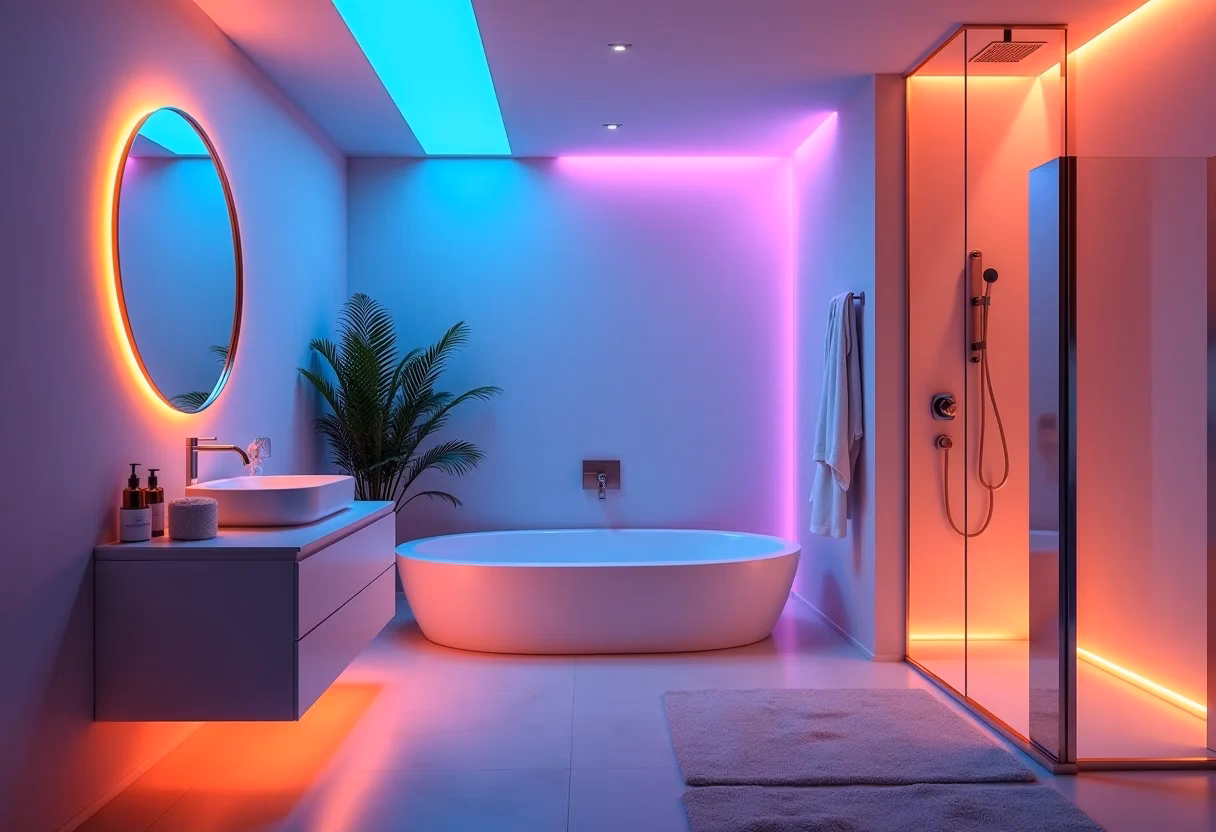 A iluminação com LED é a forma mais prática e versátil de adicionar cromoterapia ao seu banheiro. Existem fitas de LED, lâmpadas e até mesmo chuveiros com LED que mudam de cor. Imagina que incrível tomar um banho com a água iluminada em tons relaxantes!