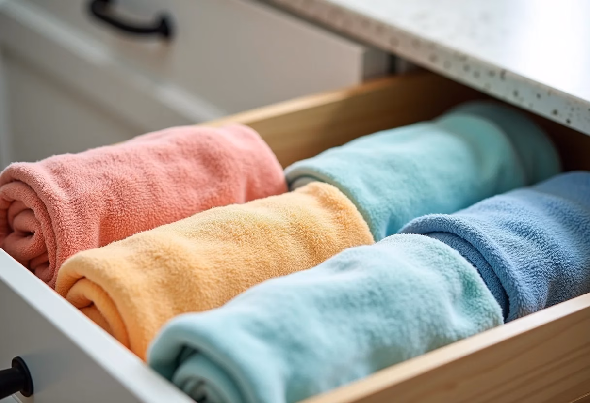 Com a organização, você aproveita melhor o espaço nas suas gavetas e armários. Panos dobrados e organizados ocupam menos espaço do que aqueles jogados de qualquer jeito. Além disso, fica mais fácil encontrar o pano certo na hora que você precisa.