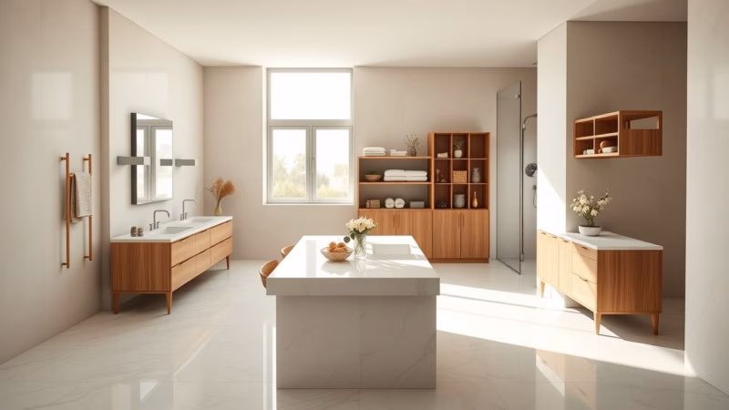 O layout é crucial em um banheiro grande. Espaços generosos pedem soluções que otimizem a circulação e a funcionalidade. Uma ilha central com pia dupla, por exemplo, pode ser um ponto focal elegante e prático.