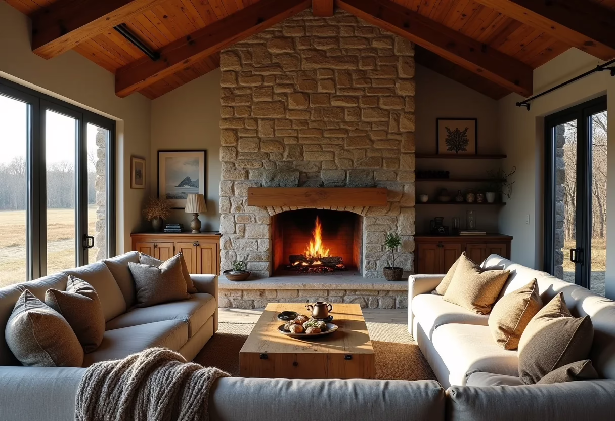 • Pedra natural: Pode ser usada em paredes, lareiras ou detalhes, agregando textura e rusticidade.
