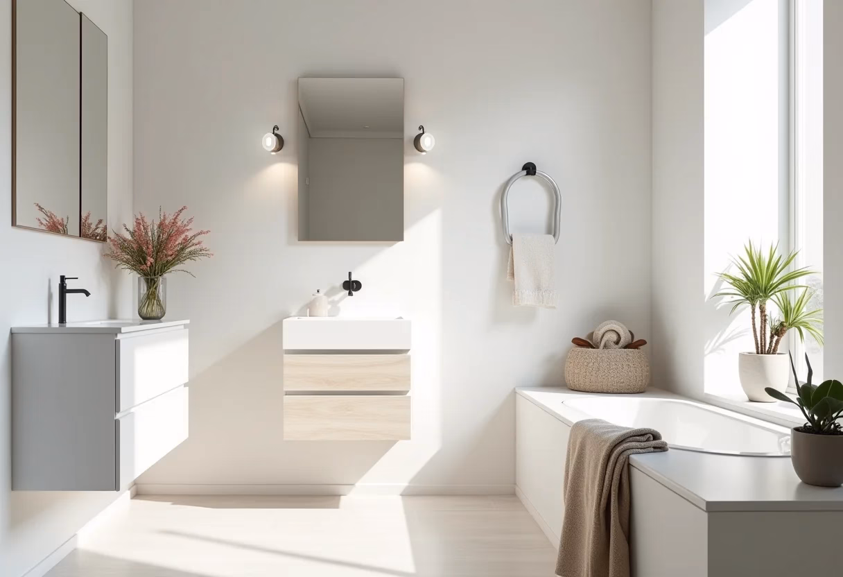 Armários suspensos e pias compactas são aliados poderosos na otimização de espaços pequenos. Além de facilitarem a limpeza, eles criam uma sensação de leveza e amplitude no banheiro.