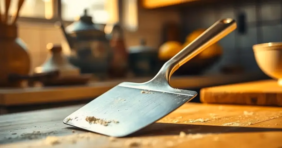 Essa é uma espátula metálica com um perfil mais baixo, quase como uma navalha, usada para raspar restos de massa ou sujeira da bancada depois do trabalho. É eficiente e ajuda a manter a cozinha limpa e organizada, mostrando a eficiência de uma espátula metálica no dia a dia. É um verdadeiro salva-vidas na hora da limpeza, retirando com facilidade aqueles pedacinhos de massa que grudam com vontade.