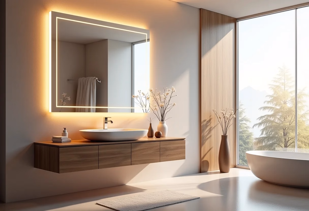 Esse modelo tem a luz de LED embutida no próprio espelho, criando um efeito clean e moderno. É perfeito para quem busca um visual minimalista e elegante.