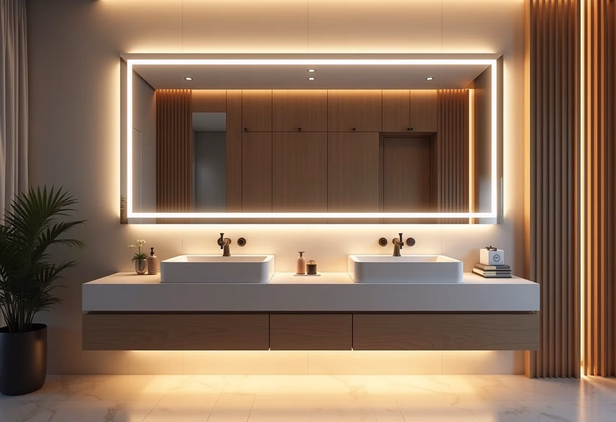 Espelho com LED em banheiro minimalista, destacando economia de energia