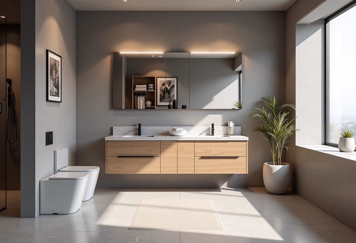 Para maior praticidade, opte por um gabinete de banheiro 90 cm com tampo de granito e espelho, que otimiza o espaço e facilita as tarefas diárias.