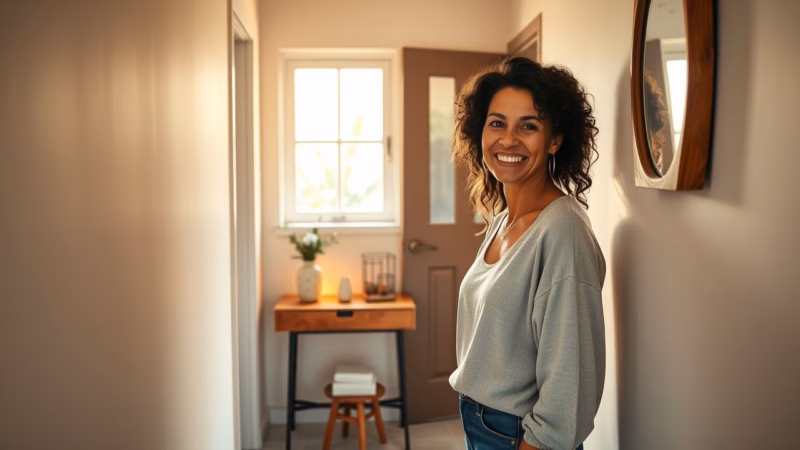 Um hall de entrada pequeno, bem iluminado e convidativo, com uma mulher sorrindo ao entrar.