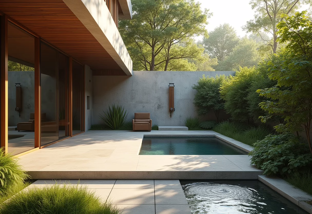 O chuveiro ao ar livre é o ponto alto do jardim. Existem diversos tipos, desde os modelos fixos, com design moderno, até os portáteis, ideais para quem busca praticidade. O Chuveiro com Aquecimento Solar é uma ótima opção para economizar energia e ter água quente sempre disponível. Para o revestimento da área do chuveiro, o Revestimento Cimentício é uma escolha elegante e resistente. E não se esqueça da privacidade: um Biombo de Bambu ou plantas altas podem criar uma barreira visual charmosa e eficaz.