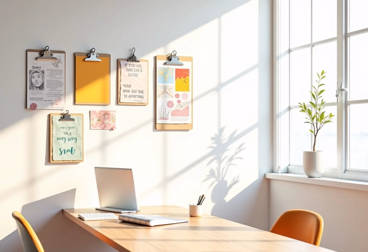 Que tal criar um mural com várias pranchetas? Você pode usar diferentes tamanhos e cores para dar um toque personalizado. Fixe fotos, frases motivacionais e até pequenos objetos que te inspirem no dia a dia. Fica um charme!