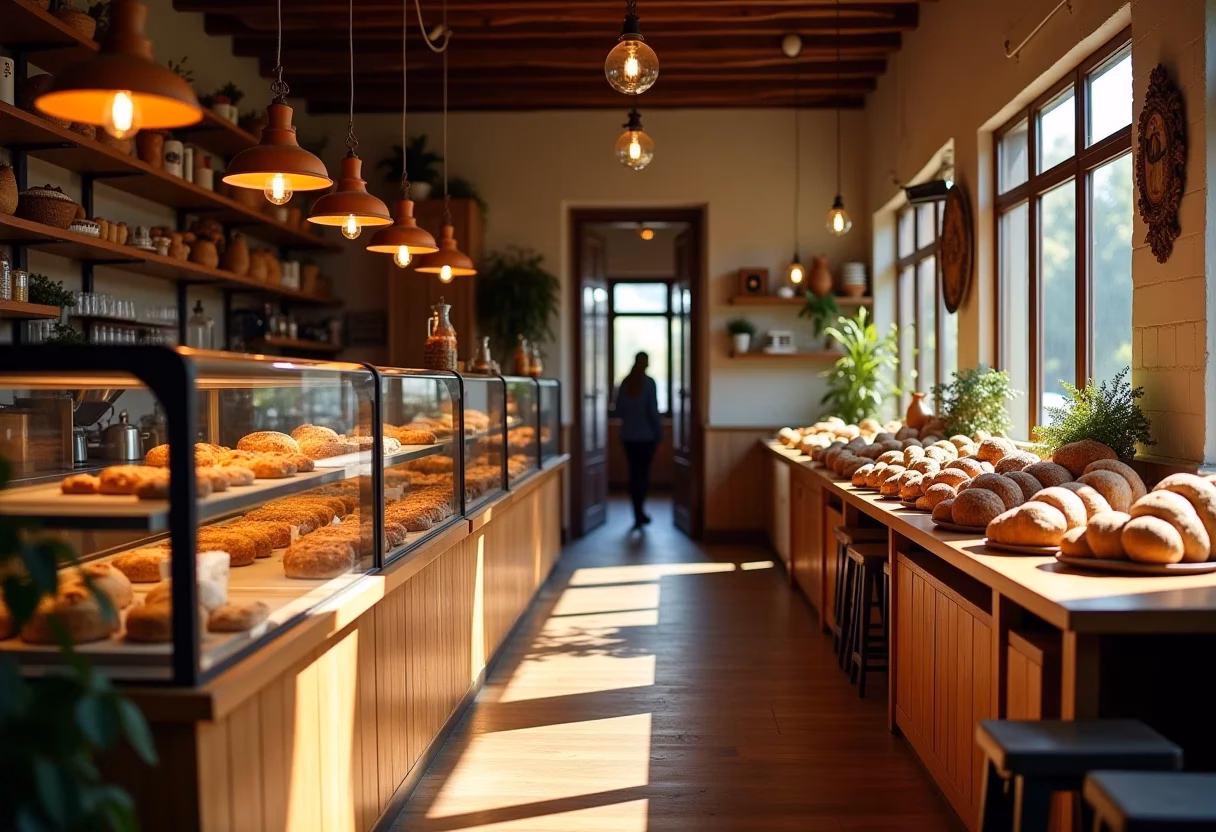A iluminação é fundamental para criar um ambiente agradável e valorizar os produtos. Use luzes quentes e indiretas para criar uma atmosfera acolhedora. Destaque os pães e bolos com spots de luz direcionados, realçando sua textura e cor. Luminárias da Lumini podem dar um toque especial ao ambiente.